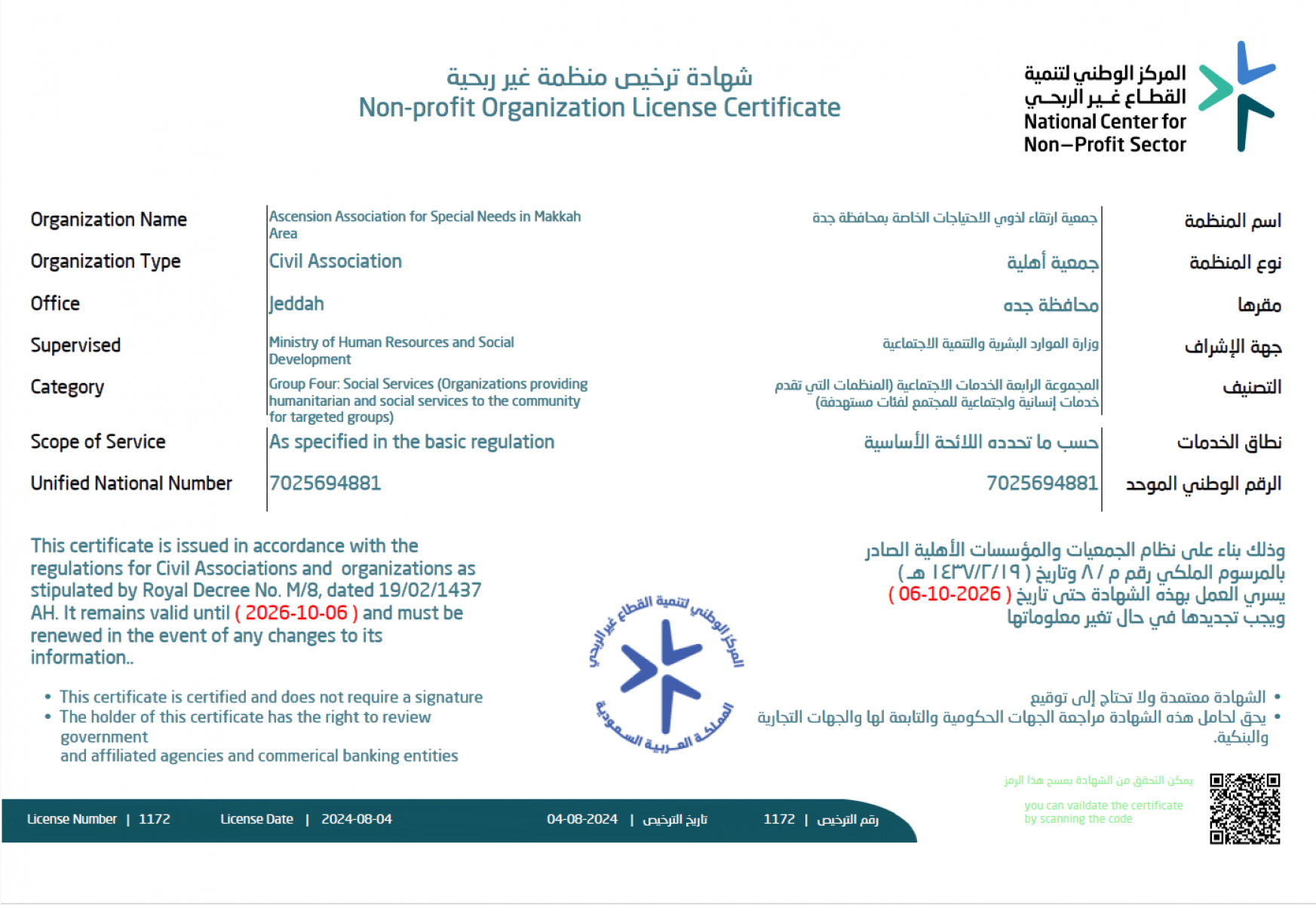 ترخيص المركز الوطني لتنمية القطاع غير الربحي رقم الترخيص 1172